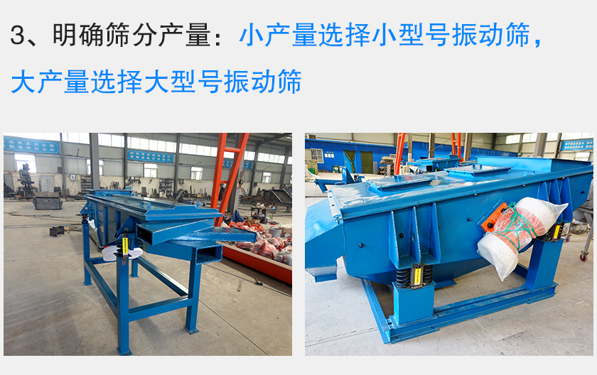 用戶對于振動篩類型已經(jīng)有了充分的把握,那么接下來就是振動篩型號的選擇,而與型號相關(guān)的數(shù)據(jù)就是產(chǎn)量了,所以需要用戶告知篩分產(chǎn)量,從而確定振動篩型號。