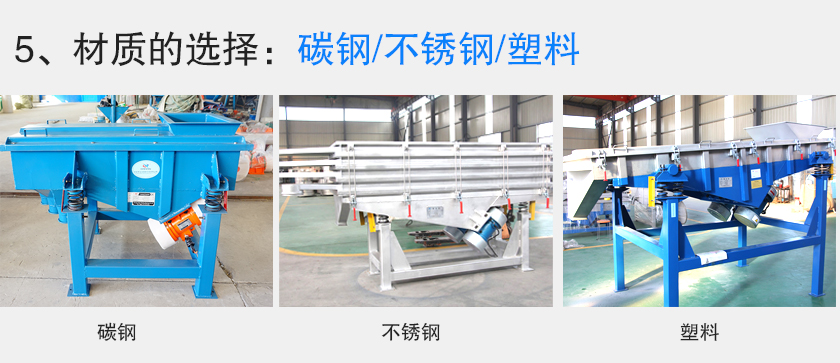 如果用戶篩分的物料是運(yùn)用到醫(yī)藥、化工、食品等行業(yè),可以優(yōu)先選擇304不銹鋼材質(zhì)的振動篩,如果篩分物料是運(yùn)用到化工行業(yè)中,且具有酸堿性、腐蝕性的話,一定要避免選用一些不銹鋼等金屬材質(zhì)的振動篩,必須選擇機(jī)身材質(zhì)為聚丙烯PP材料的振動篩。